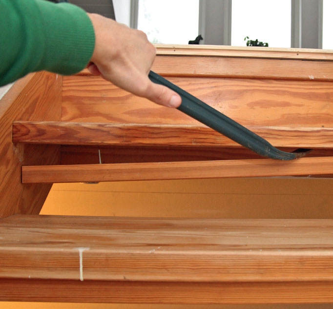 Vi fjerner den gamle listen under trinnene. Den skulle sikre at barn ikke krabbet inn mellom trinnene, der de risikerte å falle ned eller sitte fast.