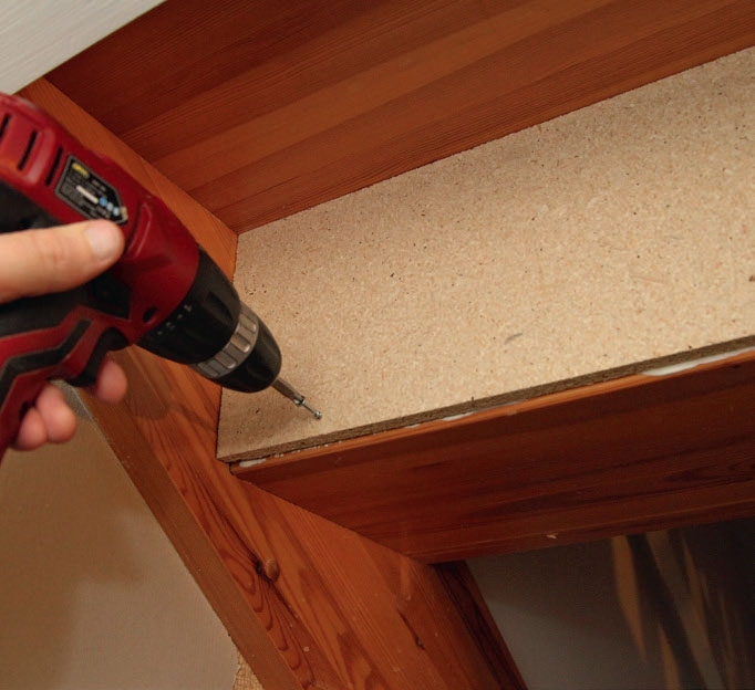 Hvert stusstrinn kan uten videre skrus på baksiden av trinnet ved underkanten. Øverst setter vi det fast ved hjelp av en list. Den skrus fast i stusstrinnet og på undersiden av trappetrinnet. Vi sikrer sammenføyninger med lim, og vi sparkler over skruer og fuger alle hjørnene.