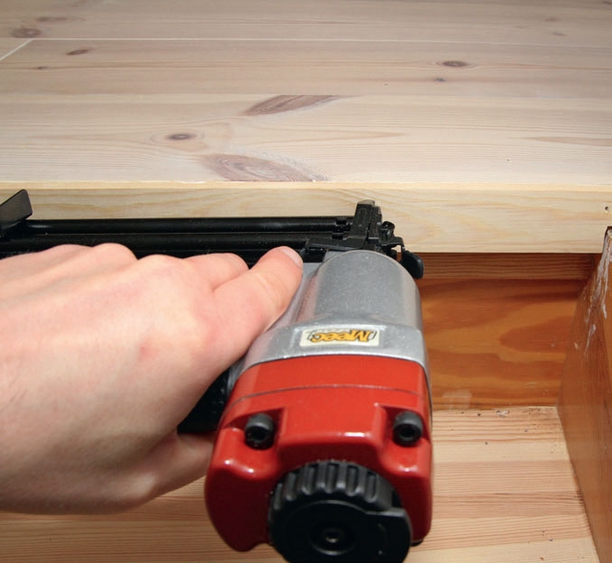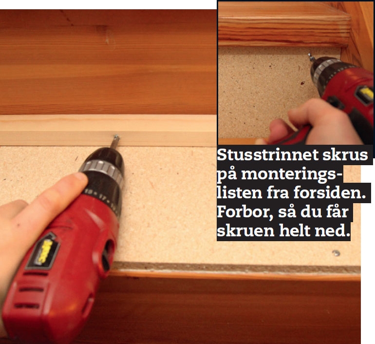 Sett fast monteringslisten på trinnet over - og så på stusstrinnet. Sjekk at stusstrinnet er loddrett. Husk lim.