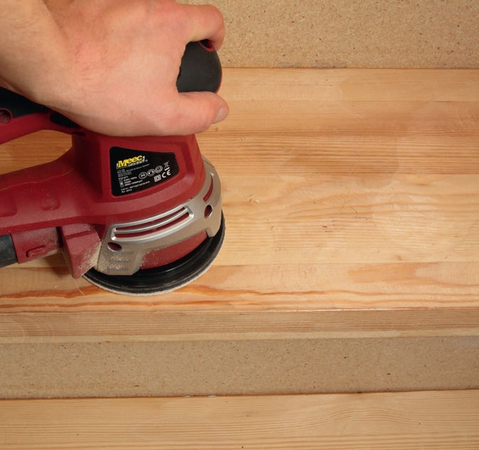 Større flater glatter du ut med eksentersliperen. Også her begynner du med korn 40. Når all lakk er borte, og alle buler fjernet, kjører du på med stadig finere slipepapir på begge slipemaskinene, til du sliper alt silkeglatt med korn 120 eller finere.