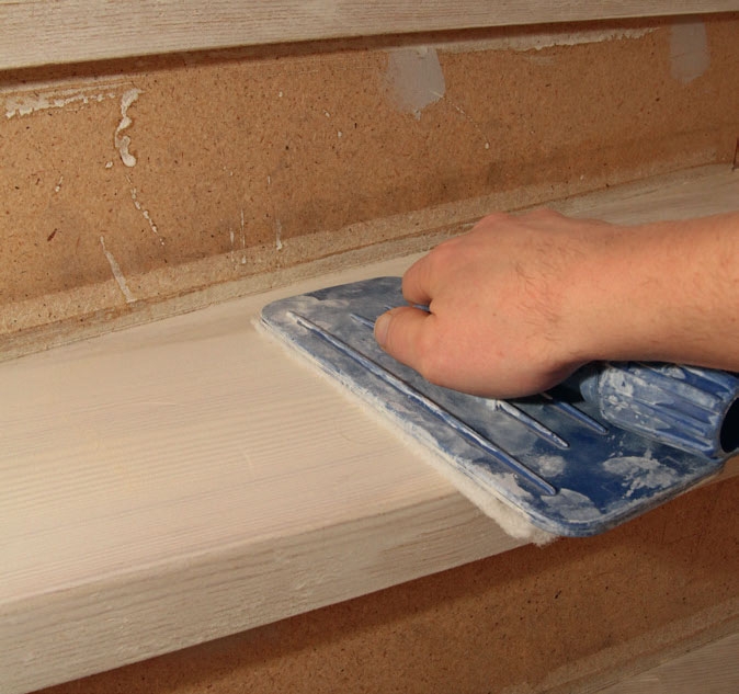 Etter åtte timer slipes den tørre hvite overflaten med en slipematte eller slipepapir korn 120. Støvsug grundig.