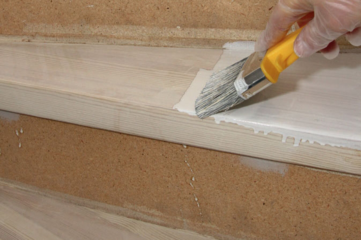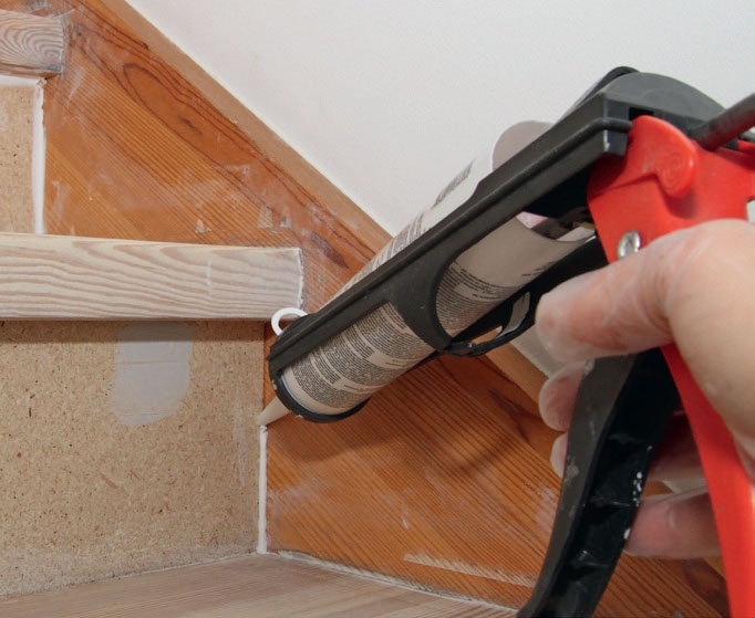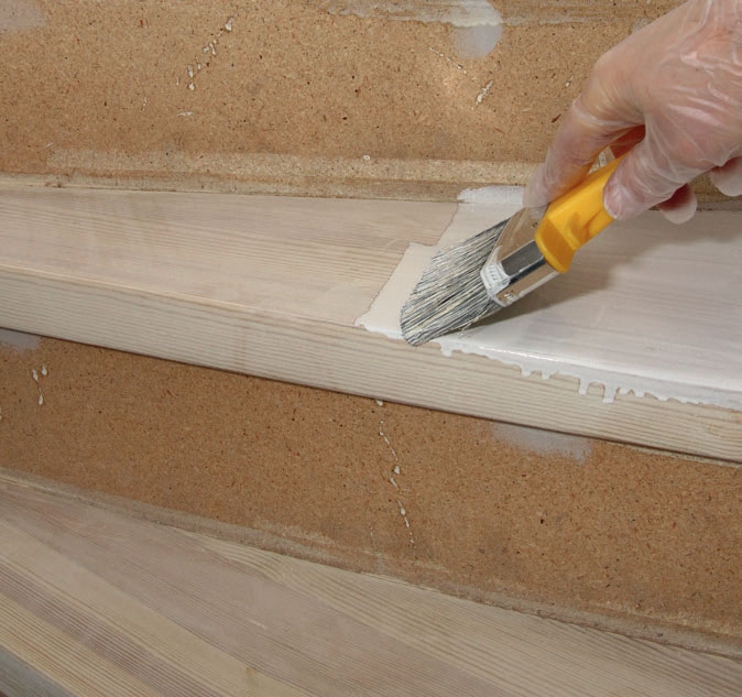 Stusstrinnet skrus fast på baksiden av trinnet - etter at alle skjøteflatene er smurt inn med lim. Limet er viktig, fordi det reduserer risikoen for knirkelyder fra trappen i fremtiden.