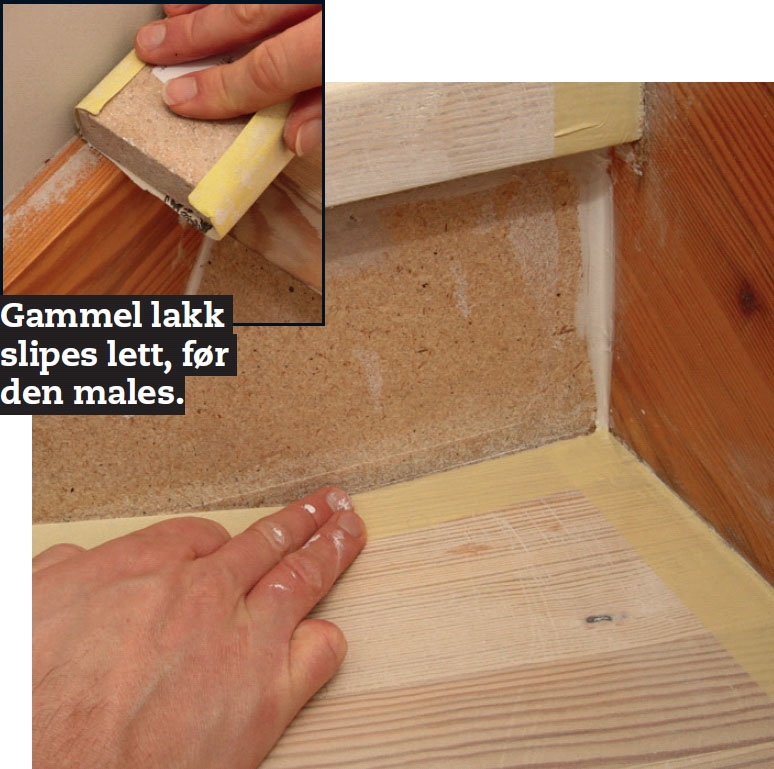 Stusstrinn og vanger klargjøres for maling. Vi dekker til med en god maskeringsteip. Den trykkes godt fast i kanten, så det ikke kan trenge inn maling under teipen. Lakken på vangene slipes lett med fint slipepapir.