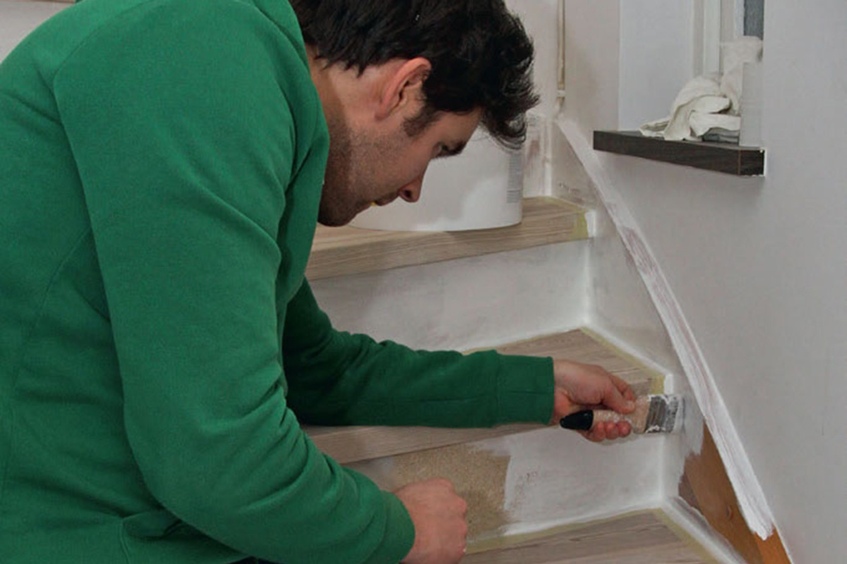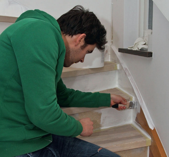 Alle overganger lukkes med en akrylfugemasse, når du igjen kan gå i trappen. Akrylfugemassen er litt elastisk og kan overmales, og maleresultatet blir penere.