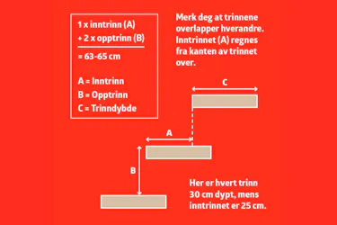 Tegn inn trappetrinnene. Hvert trinn lages av tre planker på 48 x 98 mm med 6 mm avstand (i alt 30,6 cm). Tegn opp øverste trinn mot veggen, det neste trinnet 25 cm ut og det nederste 50 cm fra veggen.