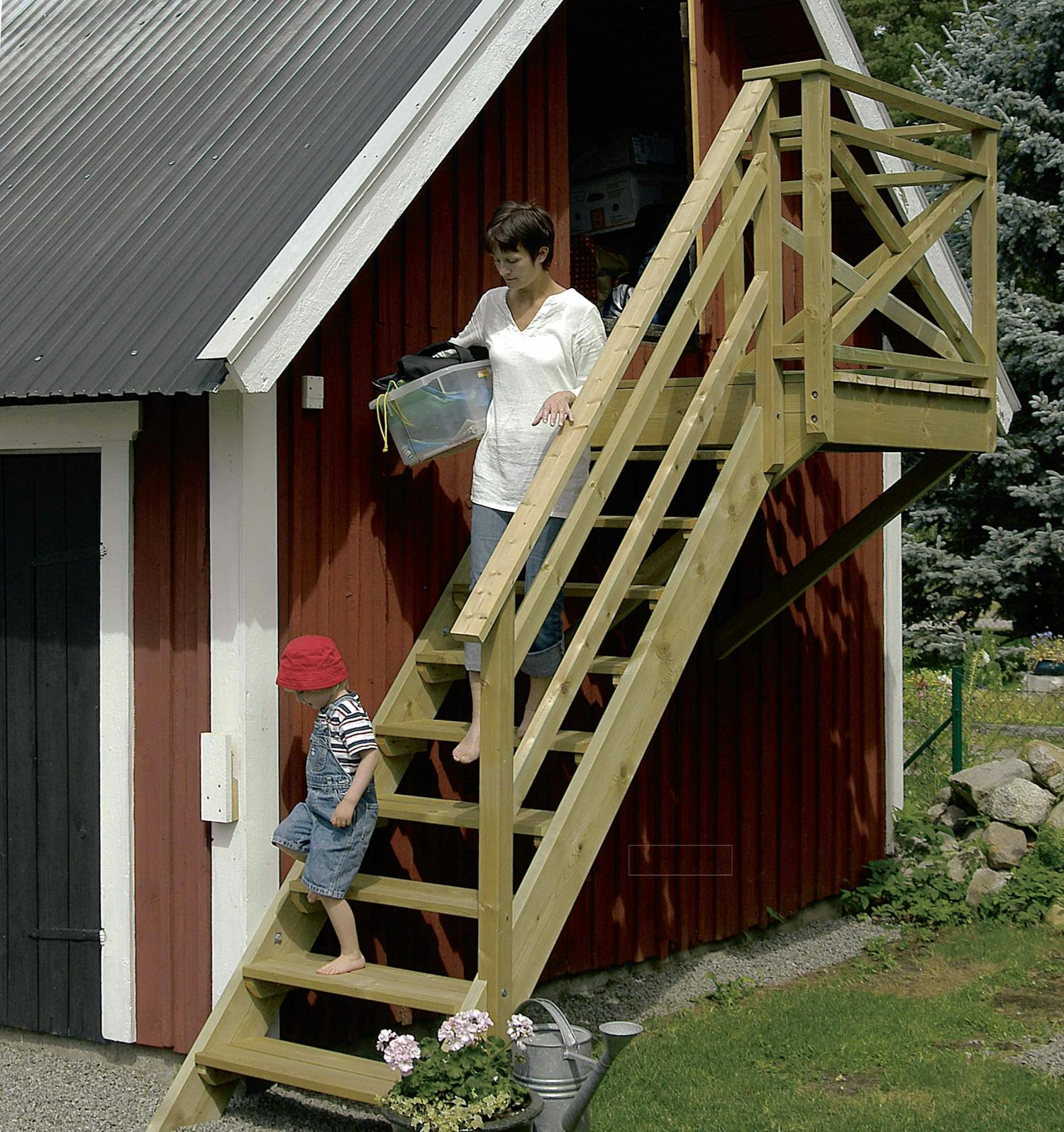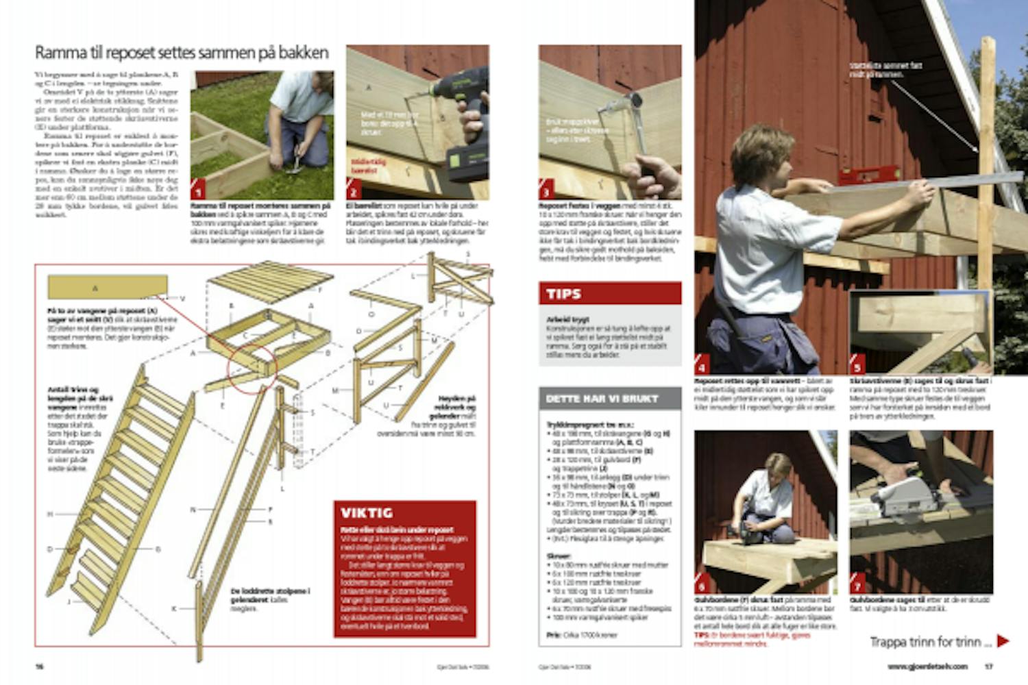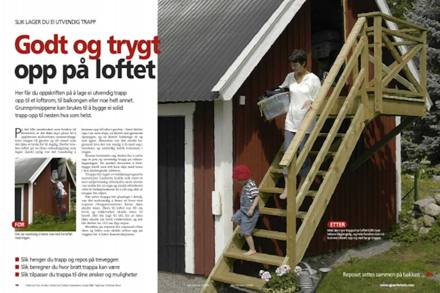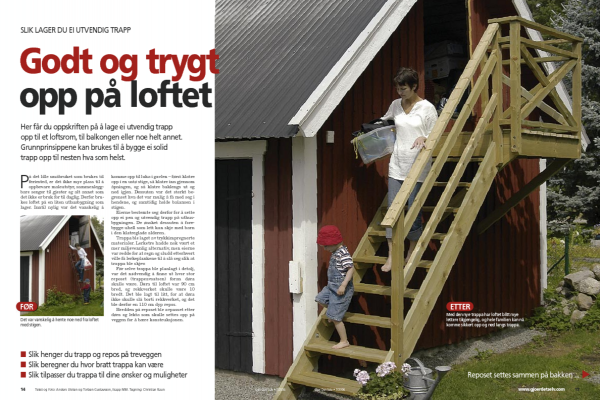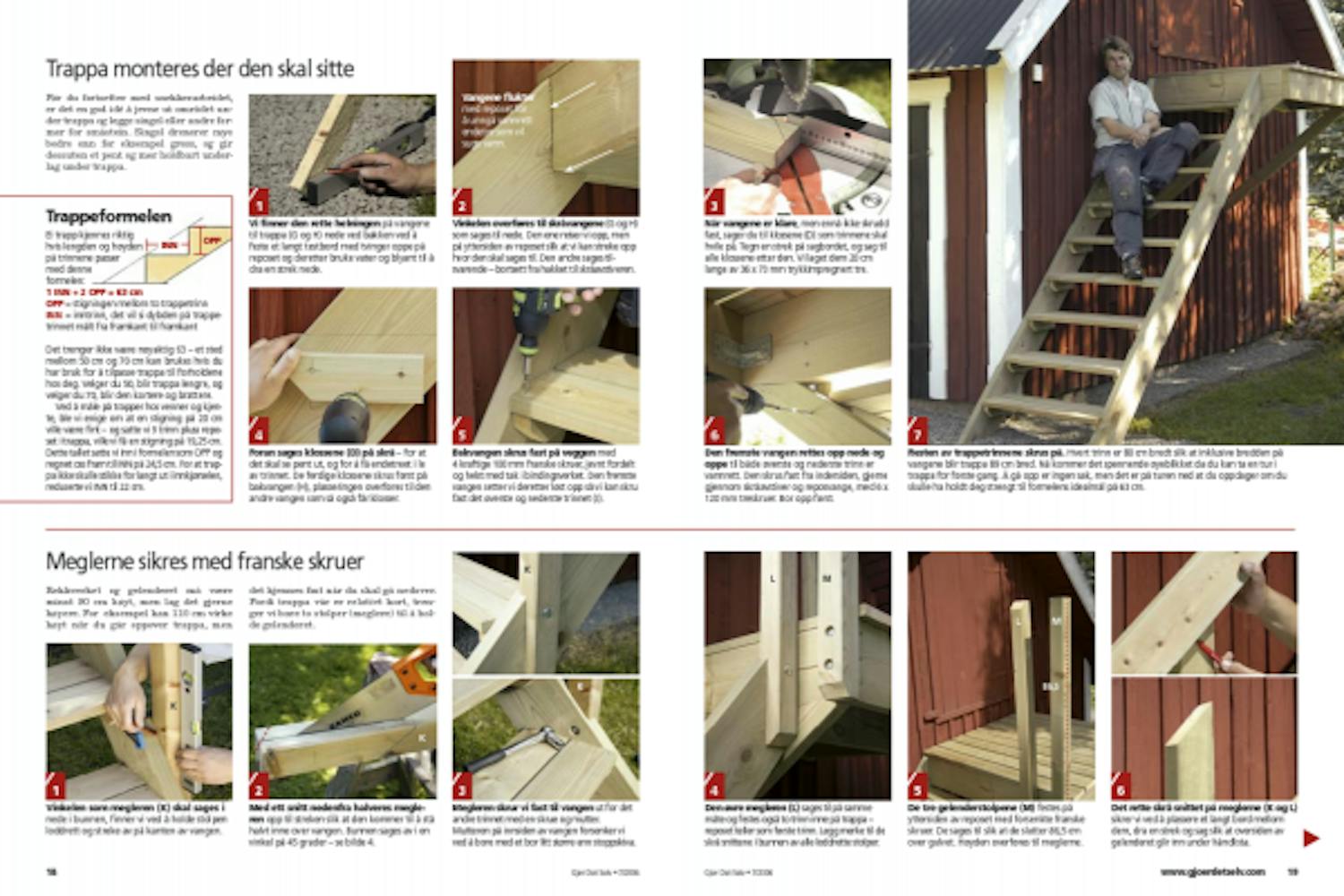 Resten av trappetrinnene skrus på. Hvert trinn er 80 cm bredt slik at inklusive bredden på vangene blir trappa 89 cm bred. Nå kommer det spennende øyeblikket da du kan ta en tur i trappa for første gang. Å gå opp er ingen sak, men det er på turen ned at du oppdager om du skulle ha holdt deg strengt til formelens idealmål på 63 cm.