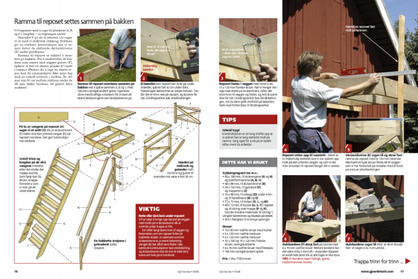 Ramma til reposet er enklest å mon-tere på bakken. For å understøtte de bor-dene som senere skal utgjøre gulvet (F), spikrer vi fast en ekstra planke (C) midt i ramma. Ønsker du å lage en større re-pos, kan du sannsynligvis ikke nøye deg med en enkelt avstiver i midten. Er det mer enn 60 cm mellom støttene under de 28 mm tykke bordene, vil gulvet føles usikkert.