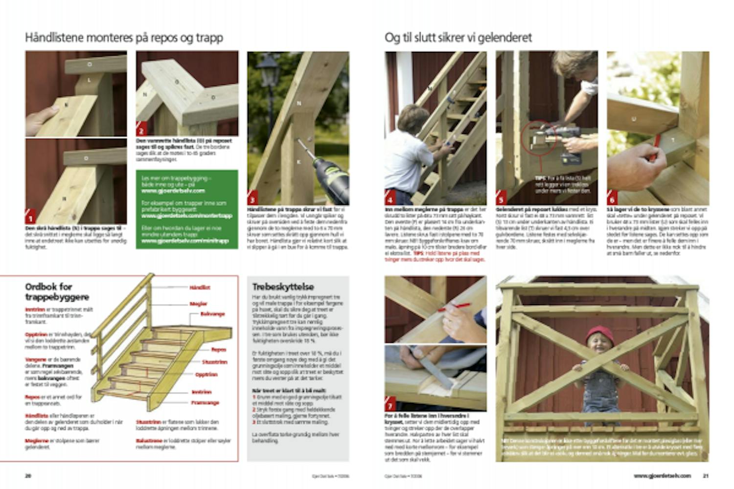 Rekkverket og gelenderet må være minst 90 cm høyt, men lag det gjerne høyere. For eksempel kan 110 cm virke høyt når du går oppover trappa, men det kjennes fint når du skal gå nedover. Fordi trappa vår er relativt kort, tren-ger vi bare to stolper (meglere) til å holde gelenderet.