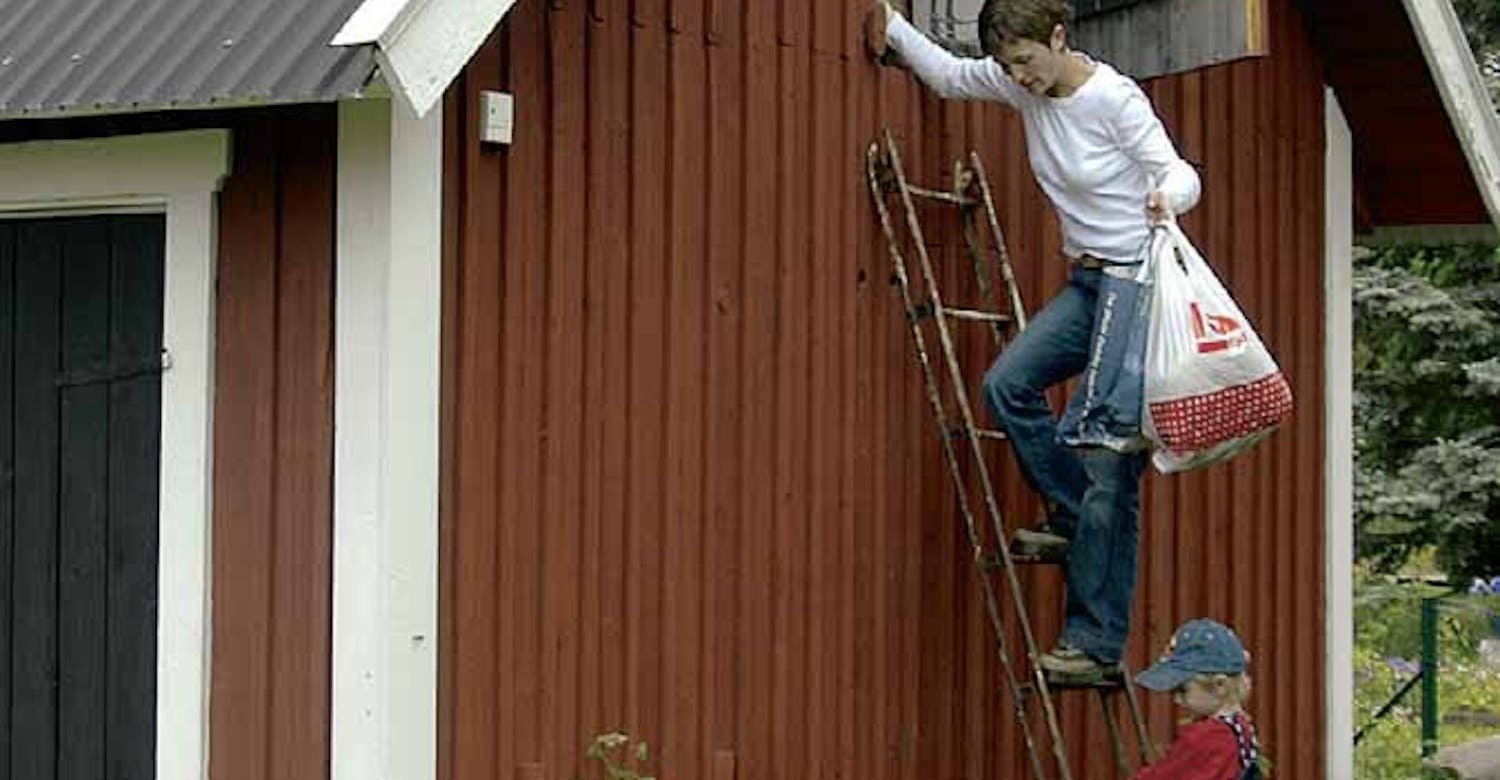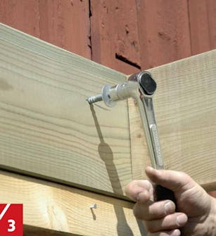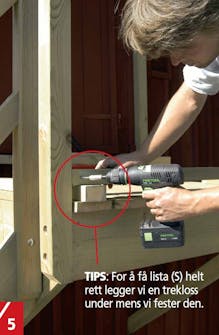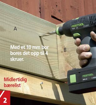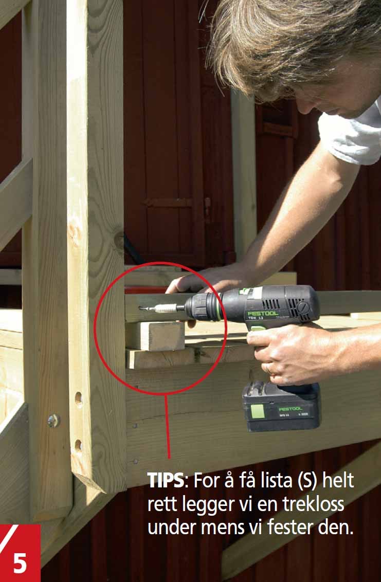 Ei bærelist som reposet kan hvile på under arbeidet, spikres fast 42 cm under døra. Plasseringen bestemmes av lokale forhold - her blir det et trinn ned på reposet, og skruene får tak i bindingsverket bak ytterkledningen.
