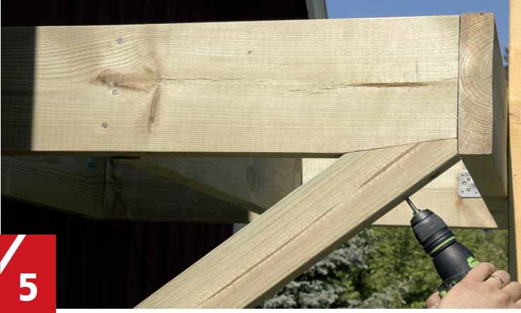 Skråavstiverne (E) sages til og skrus fast i ramma på reposet med to 120 mm treskruer. Med samme type skruer festes de til veggen som vi har forsterket på innsiden med et bord på tvers av ytterkledningen.