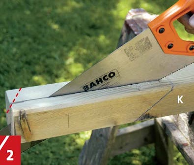Med ett snitt nedenfra halveres megle-ren opp til streken slik at den kommer til å stå halvt inne over vangen. Bunnen sages av i en vinkel på 45 grader - se bilde 4.