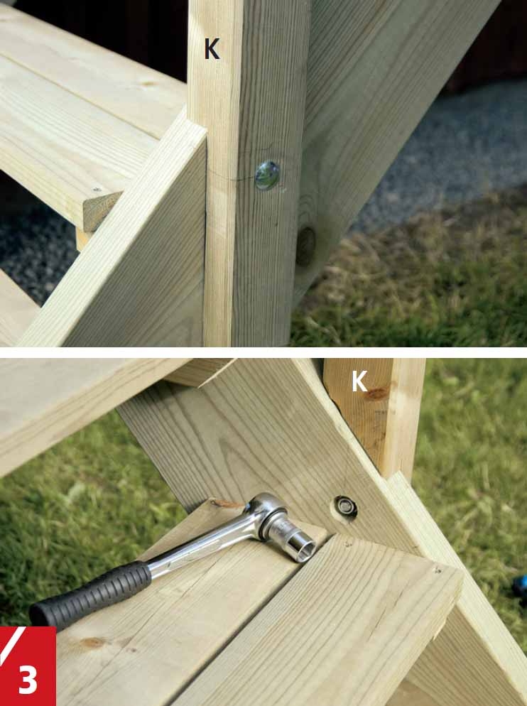 Bakvangen skrus fast på veggen med 4 kraftige 100 mm franske skruer, jevnt fordelt og helst med tak i bindingsverket. Den fremste vangen setter vi deretter løst opp så vi kan skru fast det øverste og nederste trinnet (J).