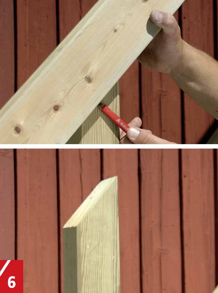 Når vangene er klare, men ennå ikke skrudd fast, sager du til klossene (D) som trinnene skal hvile på. Tegn en strek på sagbordet, og sag til alle klossene etter den. Vi laget dem 20 cm lange av 36 x 73 mm trykkimpregnert tre.