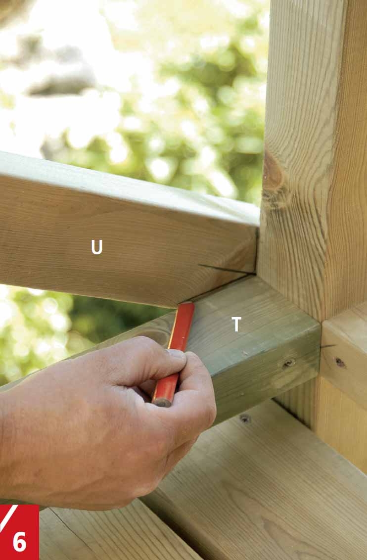 Gelenderet på reposet lukkes med et kryss. Først skrur vi fast ei 48 x 73 mm vannrett list (S) 13 cm under underkanten av håndlista. Ei tilsvarende list (T) skruer vi fast 4,5 cm over gulvbordene. Listene festes med selvskjæ-rende 70 mm skruer, skrått inn i meglerne fra hver side.