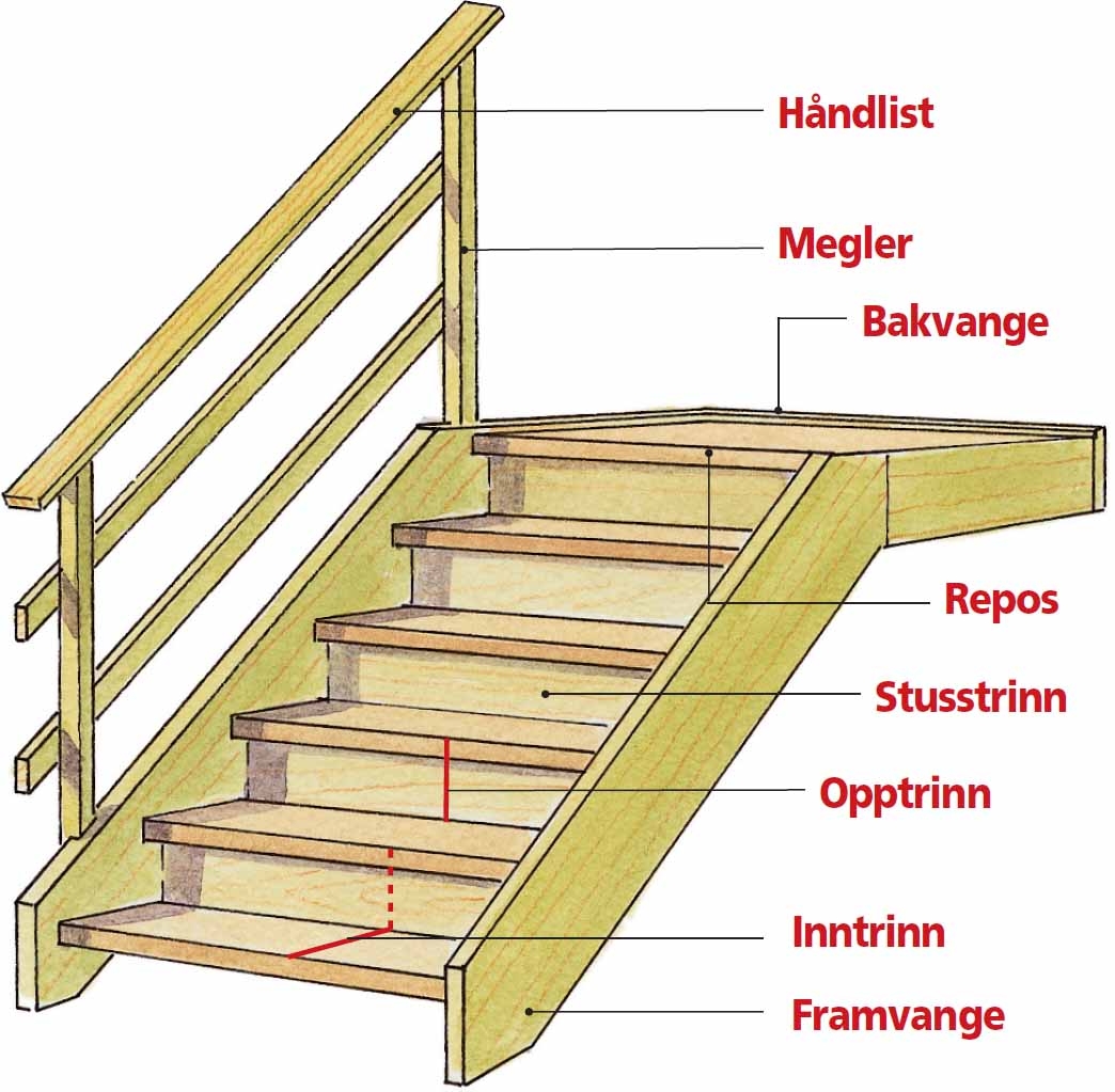 Den øvre megleren (L) sages til på samme måte og festes også to trinn inne på trappa - reposet teller som første trinn. Legg merke til de skrå snittene i bunnen av alle loddrette stolper.