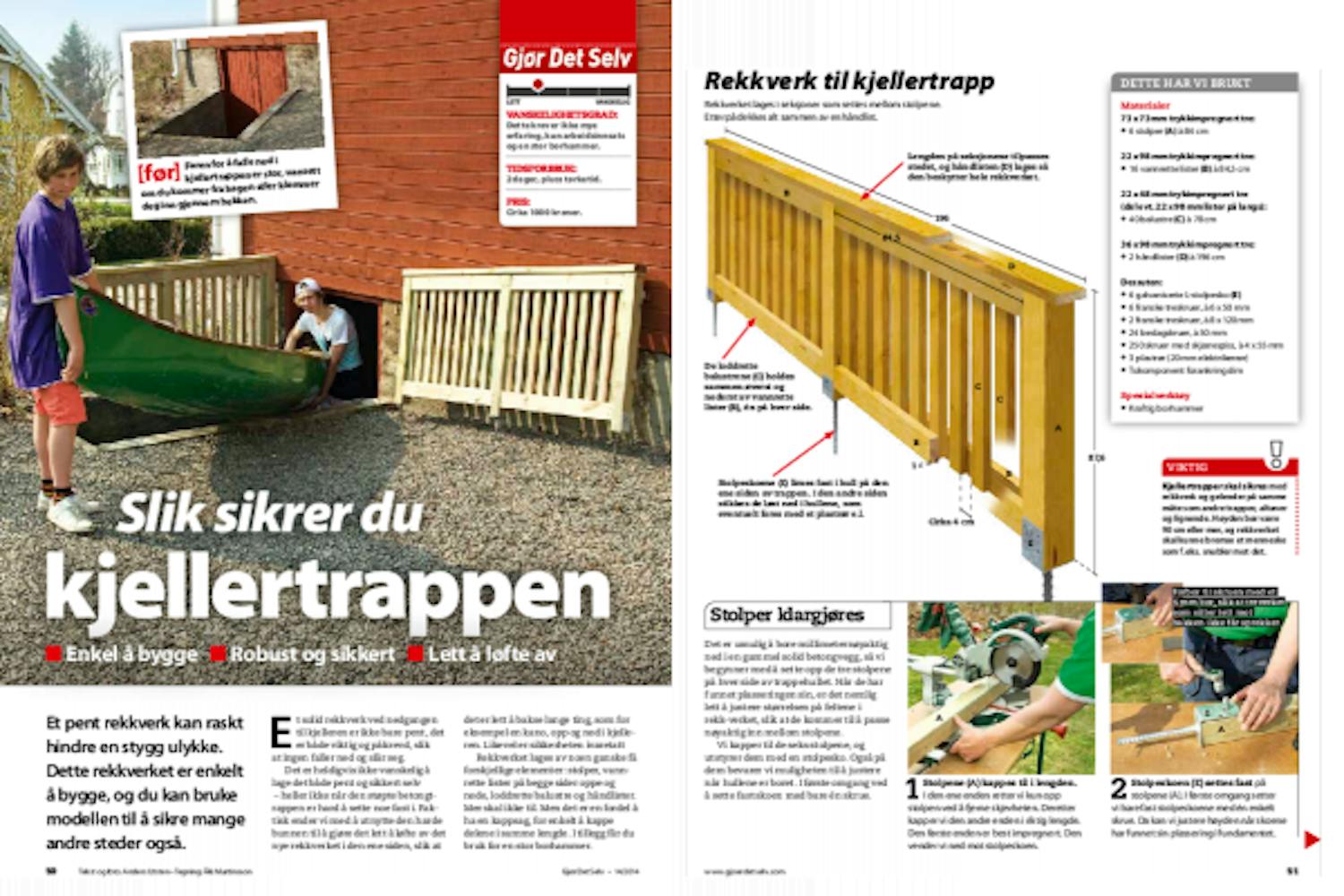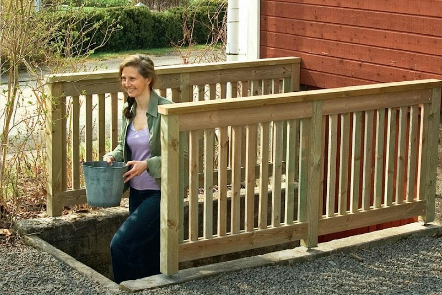 Den støpte kjellernedgangen er hard å sette noe fast i. Til gjengjeld står rekkverket godt og solid når det først står.