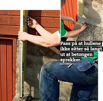 Mål ut til hullet som stolpeskoene (E) skal stå i. Den innerste stolpen skal stå helt inn mot veggen. Med et vater og stolpen med sko som redskap, finner vi fram til hvor vi skal bore i betongen.