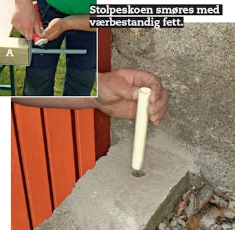 Skoene støpes ikke fast når vi har boret hull til dem. I den ene siden limer vi dem fast i hullene med forankringslim. I den andre siden skal rekkverket kunne løftes opp av hullene. Her forer vi hullet med et plastrør, så stolpeskoen kan gli opp og ned av det uten å få ødelagt galvaniseringen.