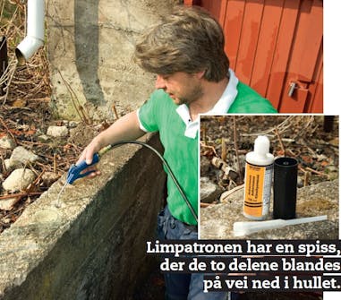 I den andre siden setter vi stolpene permanent fast. Her blåser vi hullene helt rene for støv, før vi setter patronen med tokomponent lim i fugepistolen. Du kan eventuelt bruke en annen type lim, bare det er beregnet til oppgaven.