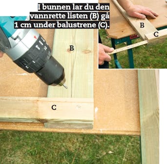 Mål avstanden mellom stolpene (A), og kapp til de vannrette listene (B), slik at de passer til i åpningene. Balustrene (C) kapper du så de blir 78 cm lange.