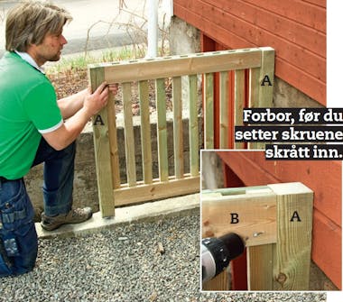 Øverst settes stolpen (A) nærmest veggen fast i et vinkelbeslag i den siden rekkverket skal kunne løftes av. Sett evt. et beslag på hver side, så rekkverket bare kan klemmes på plass. I den andre siden skrur vi fast stolpen med to 120 mm skruer.