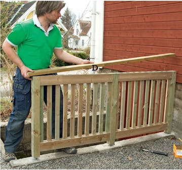 Nå kan du lage de feltene som settes inn mellom stolpene, slik at de passer nøyaktig inn i åpningen. Feltene består hver av ti loddrette balustre. Øverst og nederst er de skrudd fast på vannrette lister - en på hver side.
