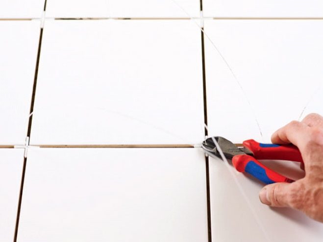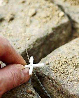 Fliskryssene settes i spenn mellom belegningssteinene, slik at fibertrå-dene kommer opp de ønskede stedene og i det ønskede mønsteret.