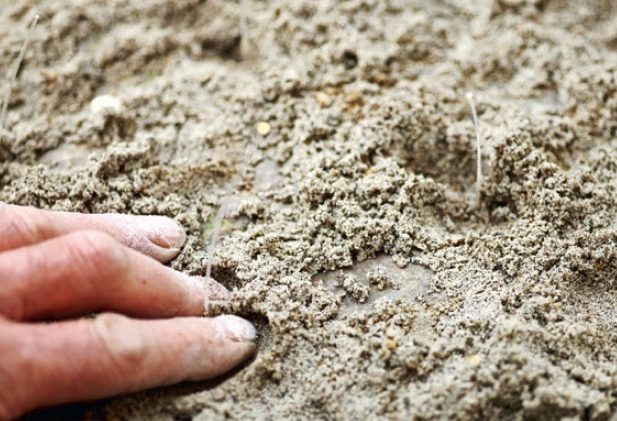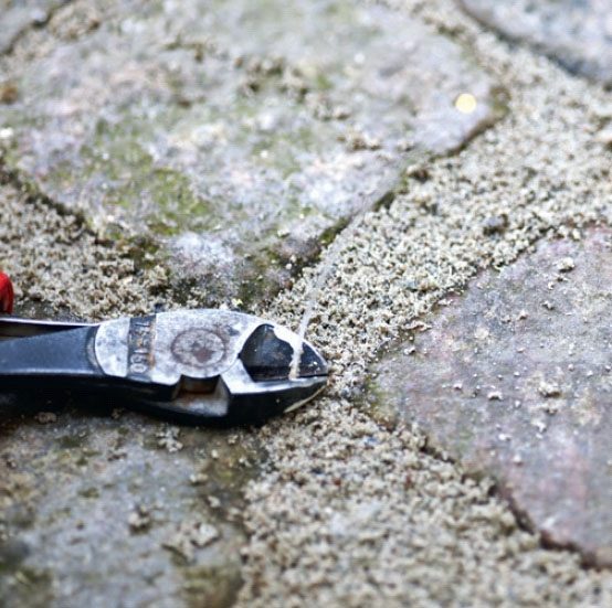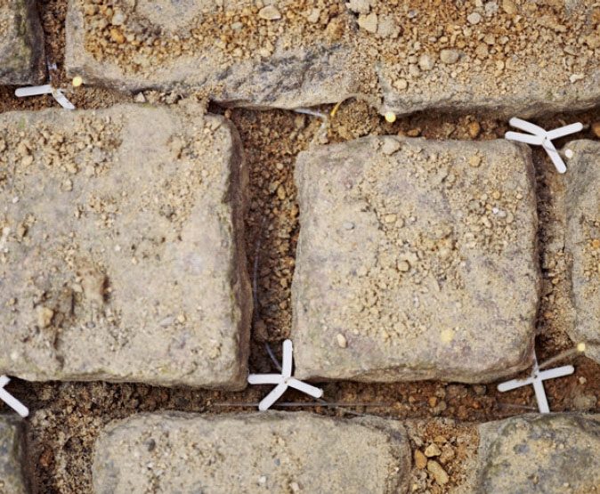 Fibertrådene legges ned mellom steinene. I forkant er fugene mellom steinene fjernet. Endene på fibertrå-dene føres opp gjennom fliskryss, der du har boret et lite hull som passer til fiberens tykkelse.
