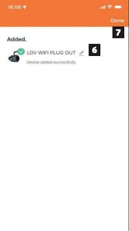 - Vent på at støpselet blir installert. Du vil bli bedt om å taste inn koden til det trådløse nettverket. Når støpselet er installert, kan du eventuelt gi det et annet navn [6]. Blir du bedt om å installere ny firmware, så gjør det. Klikk Done [7] når du er ferdig.