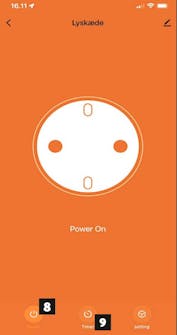 - Nå kan du flytte støpselet ut til sin rette plass. Oransje bakgrunn på skjermen betyr tent, grå slukket. Tenn og slukk på “knappen” [8], og sett en tidsstyring på [9].