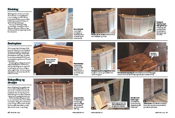 På arbeidssiden er benkeplaten cirka 90 cm høy, og består av en limtreplate som er 40 cm bred og 2,7 cm tykk.