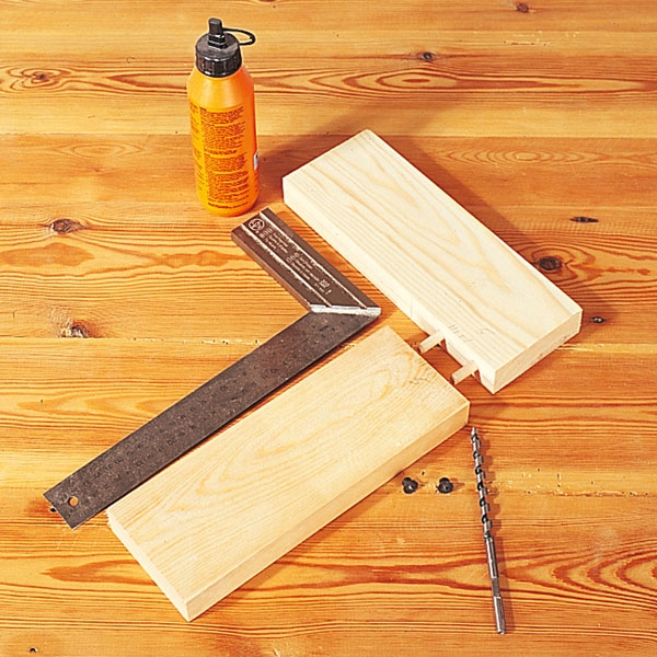 Lim de to bitene 30 x 95 mm høvlet furu sammen til en vinkel som skal utgjøre hylleknektene til hattehyllen. Det øverste vannrette stykket er 225 mm langt, og det loddrette stykket er 245 mm. Sammenføyningen lages med to plugger og trelim.