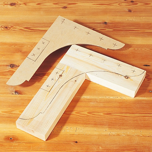 Med hjelp av en mal, tegnes hylleknektenes utvendige kurver. Dessuten markeres hull til rundstokkene til hattehyllen, og til plugghullene i knaggrekken. De utvendige kurvene sages enklest med en stikksag.