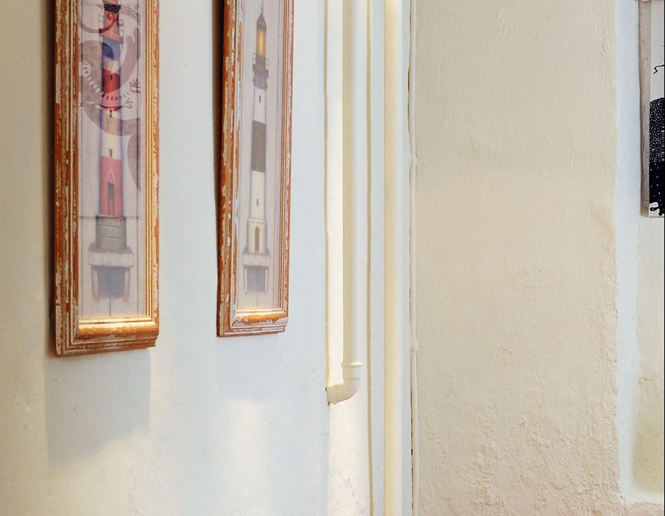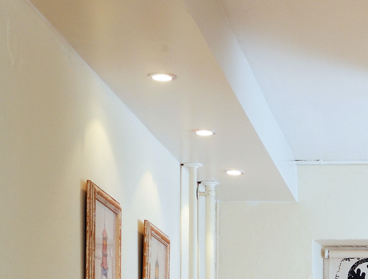 De vannrette rørene oppunder taket blender vi av med en kasse, som vi setter halogenspotter i. Det gjør rommet roligere, og fjerner en støvsamler som er vanskelig å rengjøre.