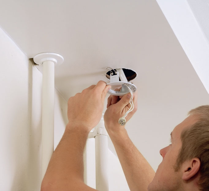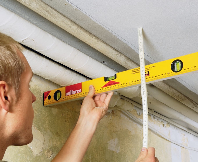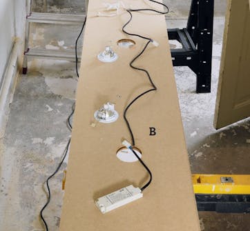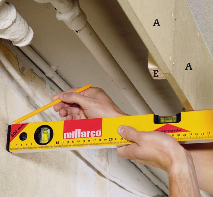MDF-plater er ideelle til oppgaven: De er stabile, sterke og lette å skjære til, og så kan de males uten videre bearbeiding. Vi fester dem ved først å skru fast et par 24 x 45 mm lekter i tak og vegg, der platene skal sitte – det er enklere enn å begyne å rote med beslag. Den nye kassen blir også glimrende å felle inn tre nye halogenspotter i. Du får kjøpt enkle sett, som du kan sette opp selv. Men du må ikke endre det, og transformatoren må være tilgjengelig.