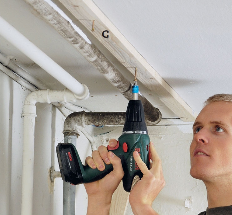 Lekten C, som frontplaten (A) skal sitte på, festes i taket. Forkanten av lekten settes slik at det blir plass til rørene i kassen. Vi venter med å skjære til platene. Hvis det blir problemer med å feste lekten, må den kanskje flyttes litt ut.