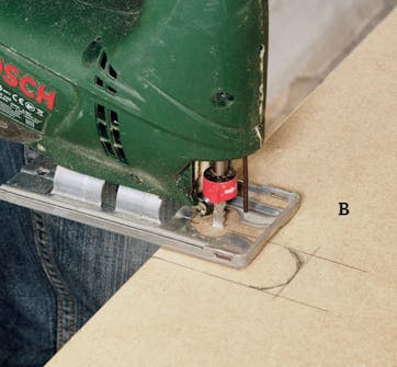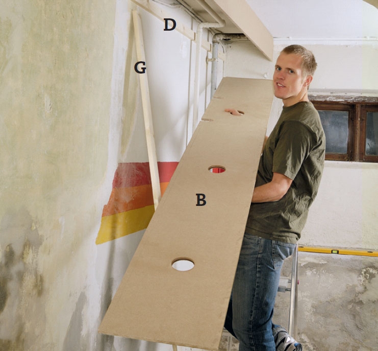Bunnplaten (B) skjæres til. Da kjellervegger sjelden er helt rette, er det best å holde fronten av kassen loddrett, og deretter ta mål derfra inn mot veggen flere steder, før du skjærer til. Mål opp hvor det skal tas ut for rør og ledninger, og skjær ut med stikksag.
