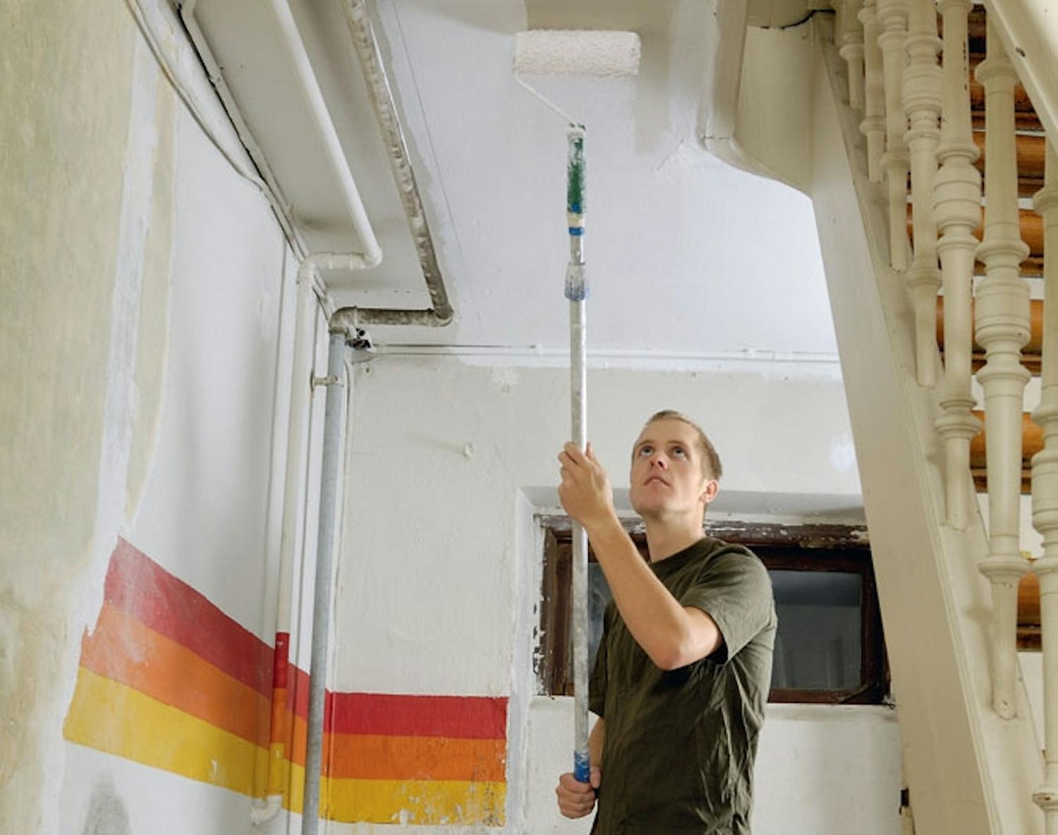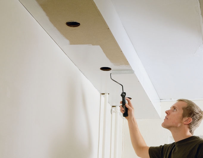 Taket males først - altså også før vi som i kjelleren her legger gulv og bygger en kasse rundt rørene i taket. Dermed slipper du å dekke til. Løs maling skrapes av, og skaden sparkles. Med rull på et forlengerskaft går malingen raskt.