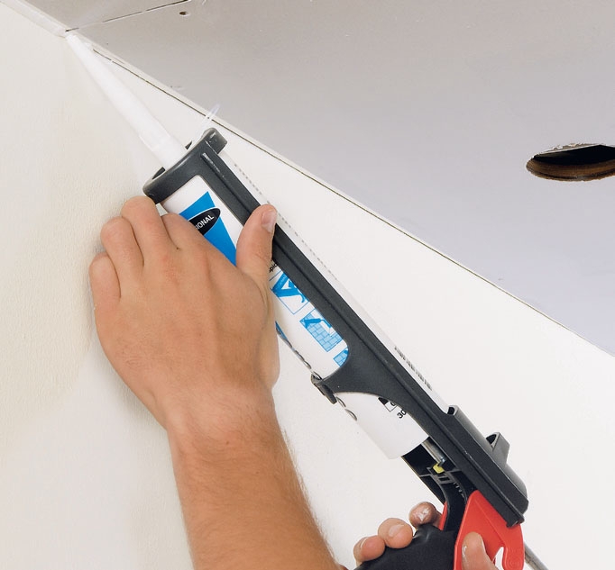 Tett sprekker og hull med akrylfug. Pistolen gjør det enkelt også å fylle en stripe med fugemasse mellom kassen og veggen. Du kan glatte den med en fuktig pensel, men det beste er å bruke en sparkel, eller spesielle, bløte plastbrikker.