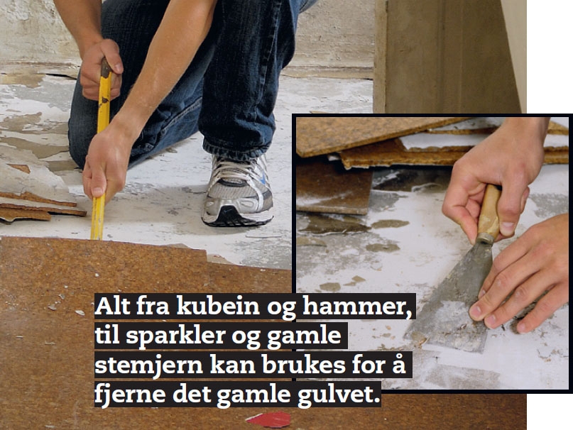 De gamle korkf isene fjernes. Det er ikke store problemet her. Det meste løsnes ved å dytte et kubein under flisene. Kun få steder er det nødvendig å banke av de siste bitene ved hjelp av en sparkel og en hammer.