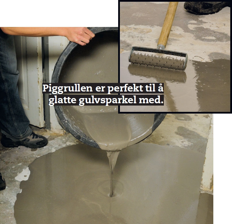 Ujevnheter rettes med selvrettende gulvsparkel. Massen blandes godt med riktig mengde vann. Les veiledningen nøye og følg målene. Det er vanskelig for en uerfaren å se om konsistensen er riktig.