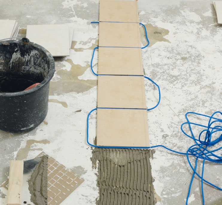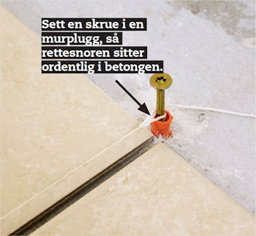 Fugebredden styres med en flissnor når du legger ut flisrekken. Til disse 20 x 20 cm store flisene passer det godt med en fuge på 5 mm. Flisene presses ned med små vridende bevegelser.