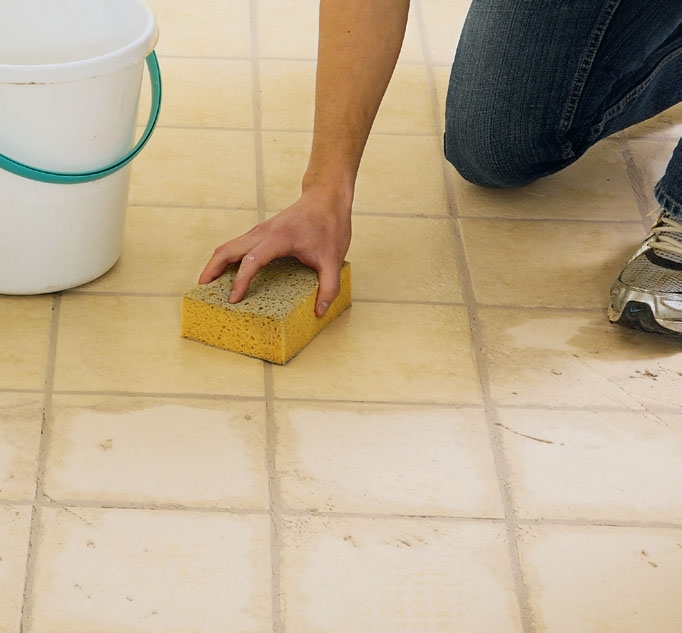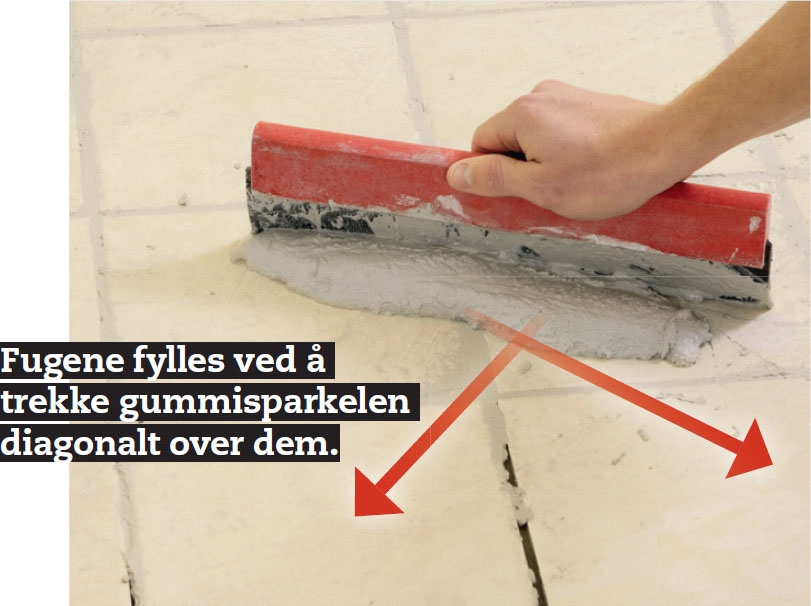 Flisene fuges med fugemasse når når limet har hatt et lite døgn for å herde. Fugemassen, som her er valgt i en lys sandfarge til de beige flisene, legges ut diagonalt over fugene. Sørg for at fugene fylles helt ut.