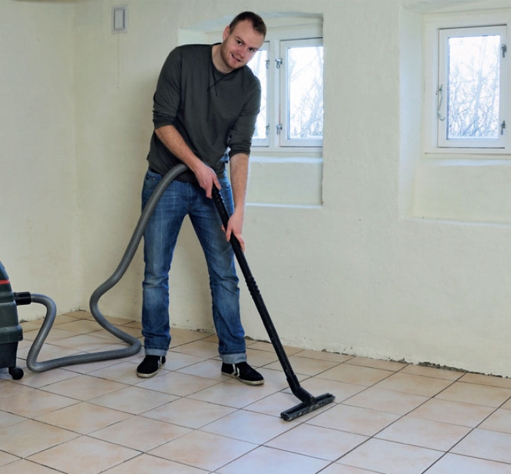 Før vi fuger, skal gulvet være helt fritt for urenheter som kan sette seg i fugens overflate. Derfor støvsuger vi grundig.