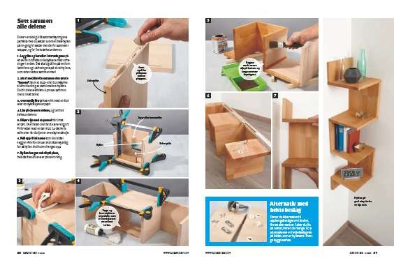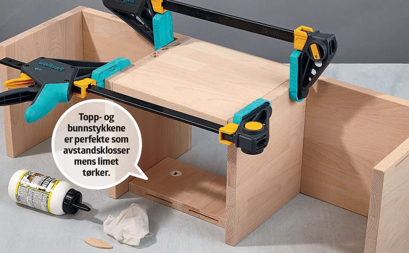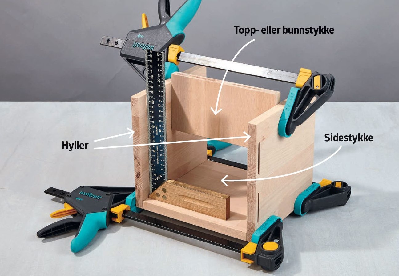 Start med å sette sammen den første “kassen”. Bruk et topp- eller bunnstykke til å holde riktig avstand mellom hyllene. Da blir delene enklere å presse sammen mens limet tørker.