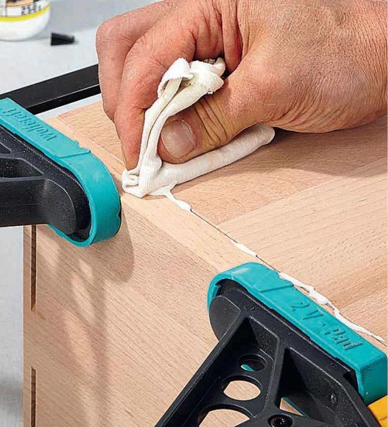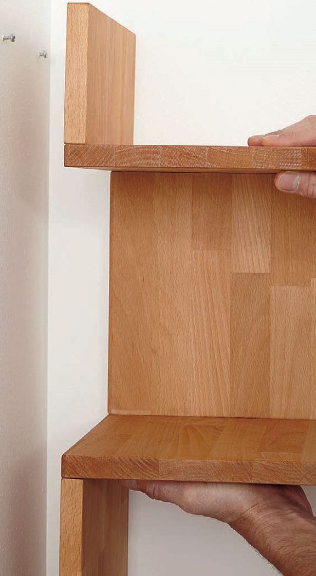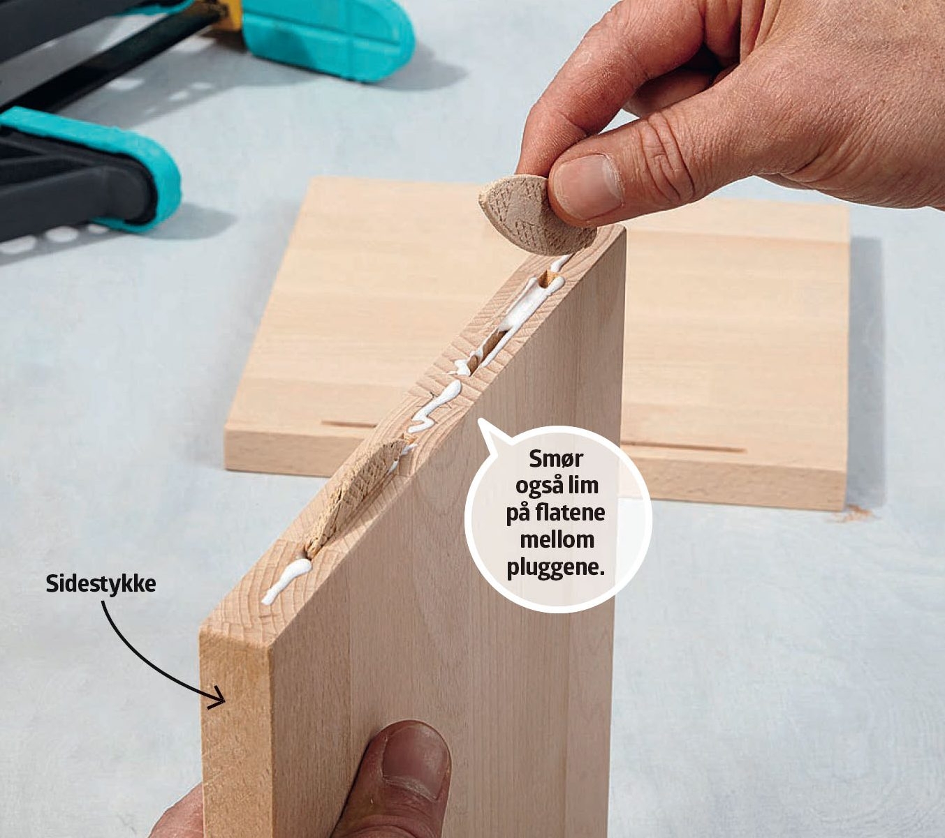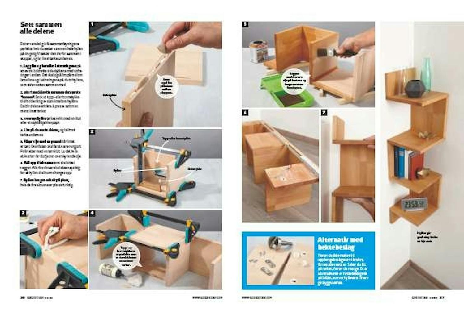 Det er vanskelig å få sammenføyningene perfekte hvis du setter sammen hele hyllen på én gang. Vi setter den derfor sammen i etapper, og lar limet tørke underveis.