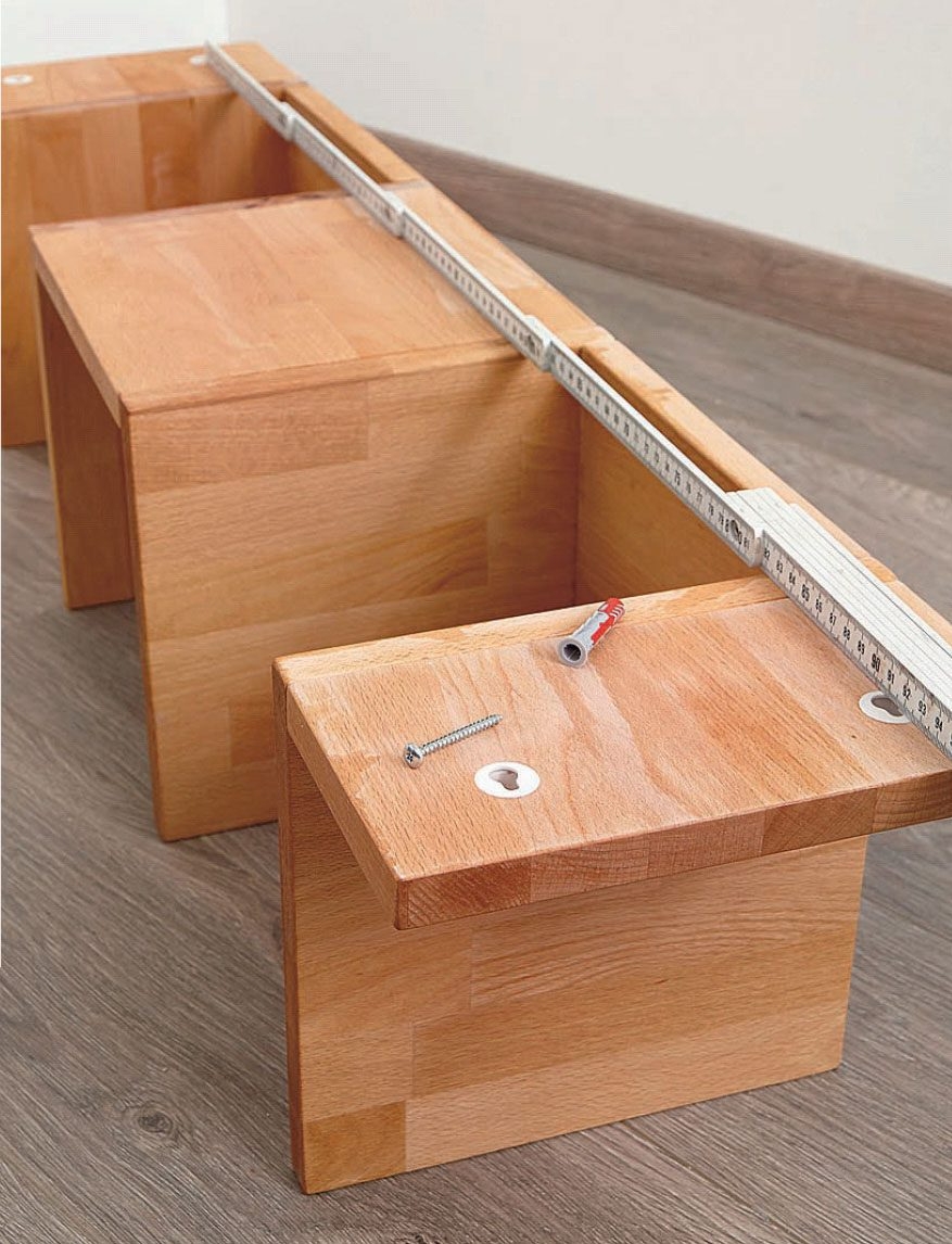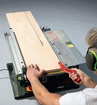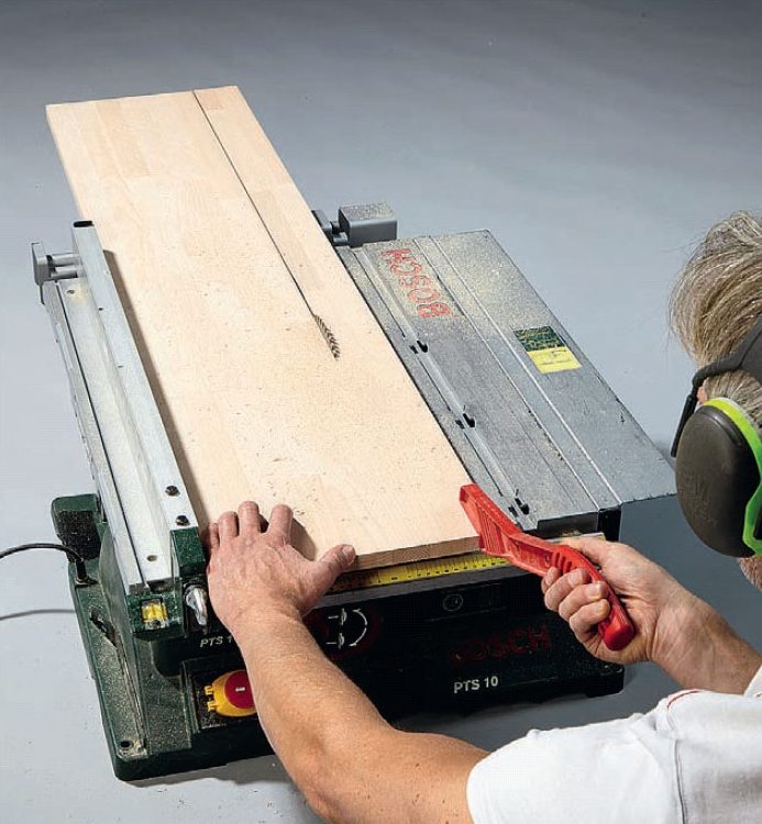 Hjørnehyllen blir bygget av to hylleplater på 30 x 120 cm, som her sages til på en bord-sirkelsag. Har du ikke en bordsirkelsag, kan du også tilpasse målene, og i stedet bruke hylleplater med en bredde på 25 cm. Da skal platene kun kappes i kortsidene. Du kan også bygge en bredere hylle, der alle sider er 30 x 30 cm. I så fall skal du bruke tre hyller à 120 cm.