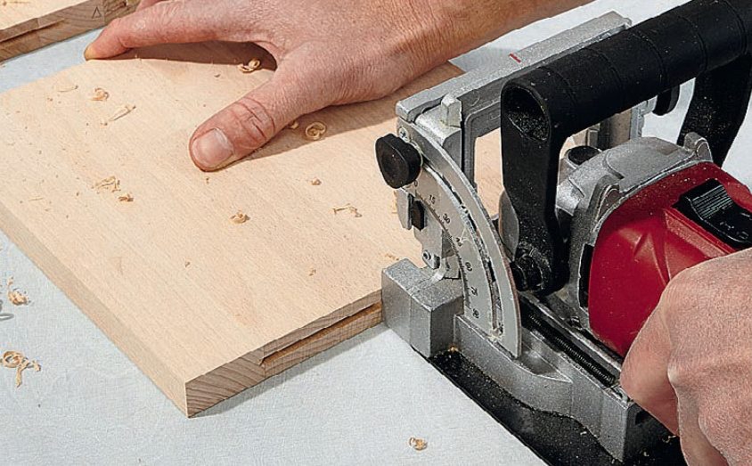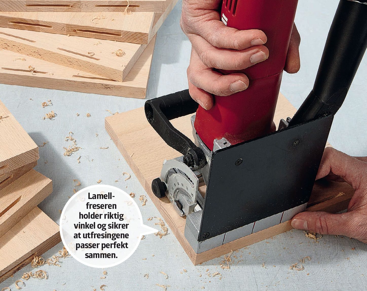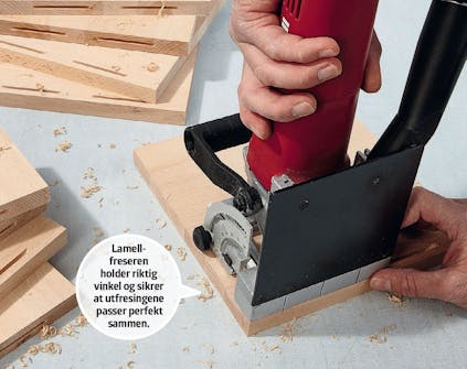 Fres ut til lamellpluggene med lamell-freseren, først på sidene av de fire vannrette hyllene. Har du ikke en lamellfreser, ser du et alternativ i den blå boksen på siden.