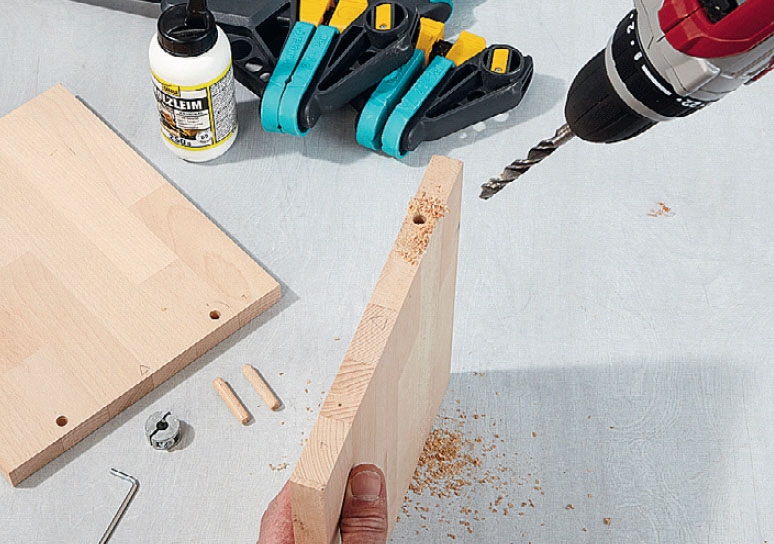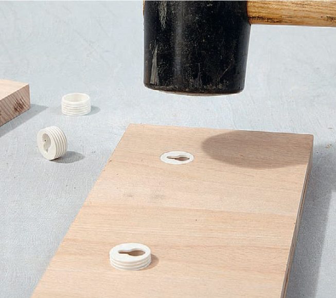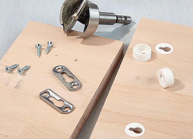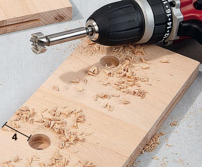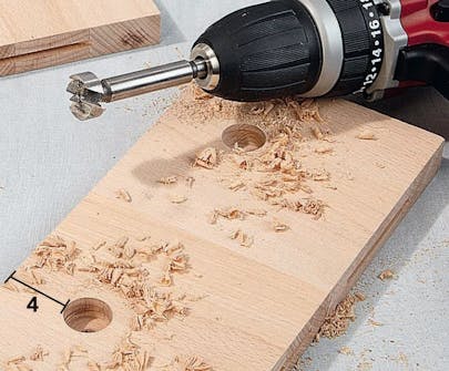Bor ut til opphengsbeslag på topp- og bunnstykket med et passe sylinderbor. Beslaget bør sitte omkring 4 cm fra kanten. Pass på at du ikke borer hele veien gjennom. Finner du ikke beslagene vi bruker, kan du se et alternativ på neste side.