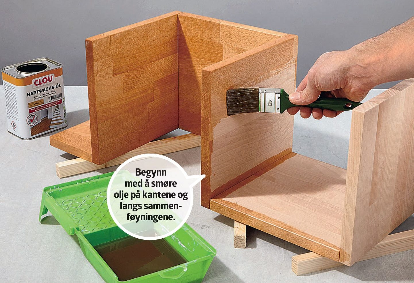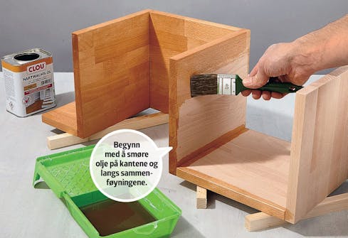 Påfør olje med en pensel når limet er tørt. Overflaten skal først være rengjort. Polér etter med en tørr klut. La det hvile et kvarter før du fjerner overskytende olje.